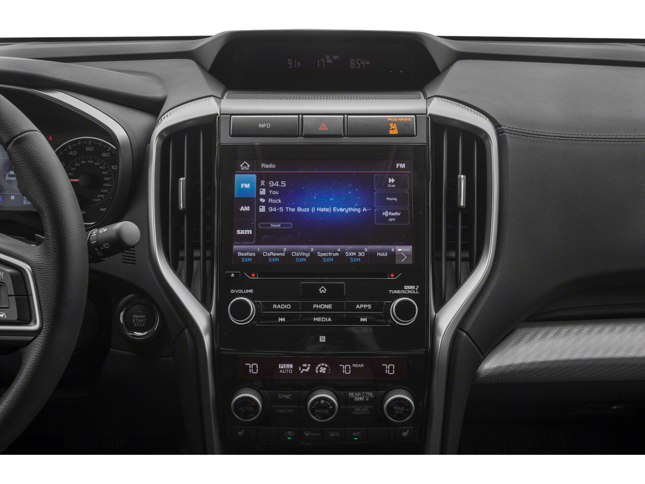 - Radio: Subaru STARLINK 8.0" Multimedia Plus System -inc: AM/FM stereo HD Radio w/single disc CD player, MP3/WMA/CRR/RW file capability, multi-touch gesture high resolution LCD display screen, voice activated controls, Bluetooth® audio streaming connectivity, Bluetooth® hands-free phone connectivity, Bluetooth® hands-free SMS text messaging connectivity (applicable w/compatible cell phone), Near Field Communication (NFC), iPod control capability, SiriusXM All Access radio (subscription required), SiriusXM Travel Link (subscription required), smartphone integration for Aha, Android Auto, CarPlay and Pandora, STARLINK cloud applications, steering wheel controls for audio and Bluetooth®, 6 speakers, 3.5mm auxiliary input jack and front and rear dual USB ports